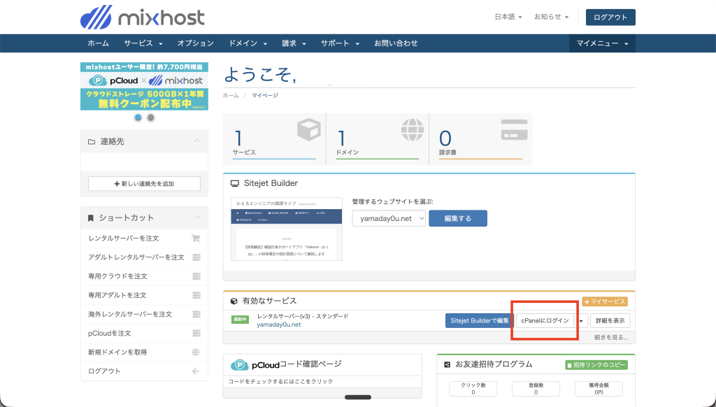 mixhostのマイページから「cPanelにログイン」をクリックしましょう。