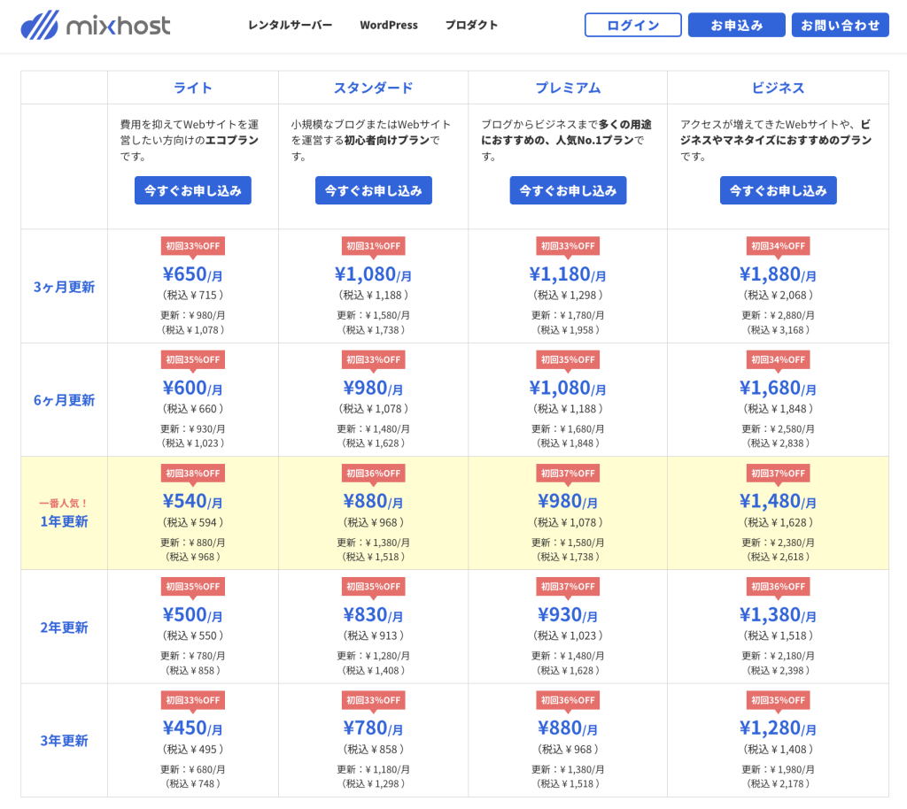 mixhostは以下の表のようにシンプルな料金体系で、お試し利用に最も向いているライトプランの3ヶ月更新なら通常料金月額980円で使えます。※最新の料金は公式サイトでご確認ください