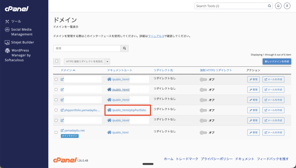ここではサブドメインphpportfolio.yamaday0u.netのドキュメントルート「/public_html/phpPortfolio」を選択します。